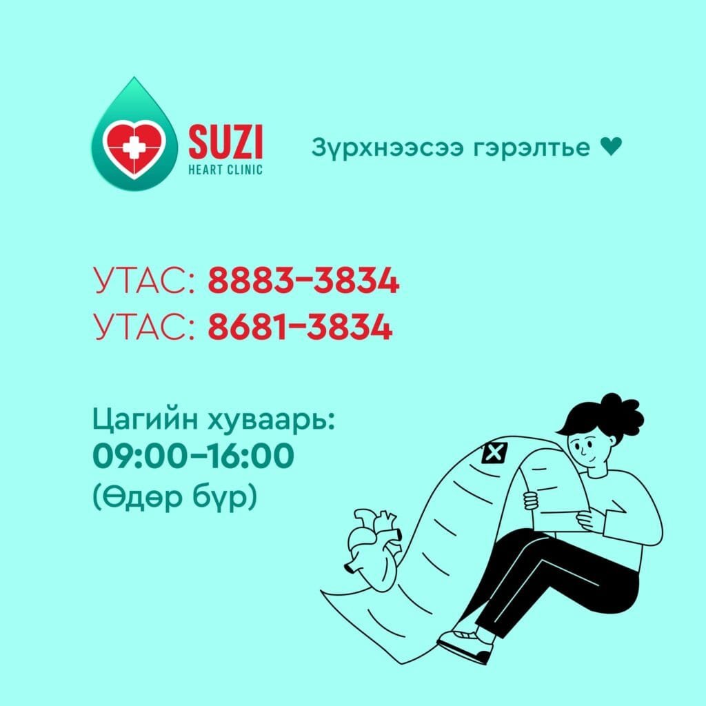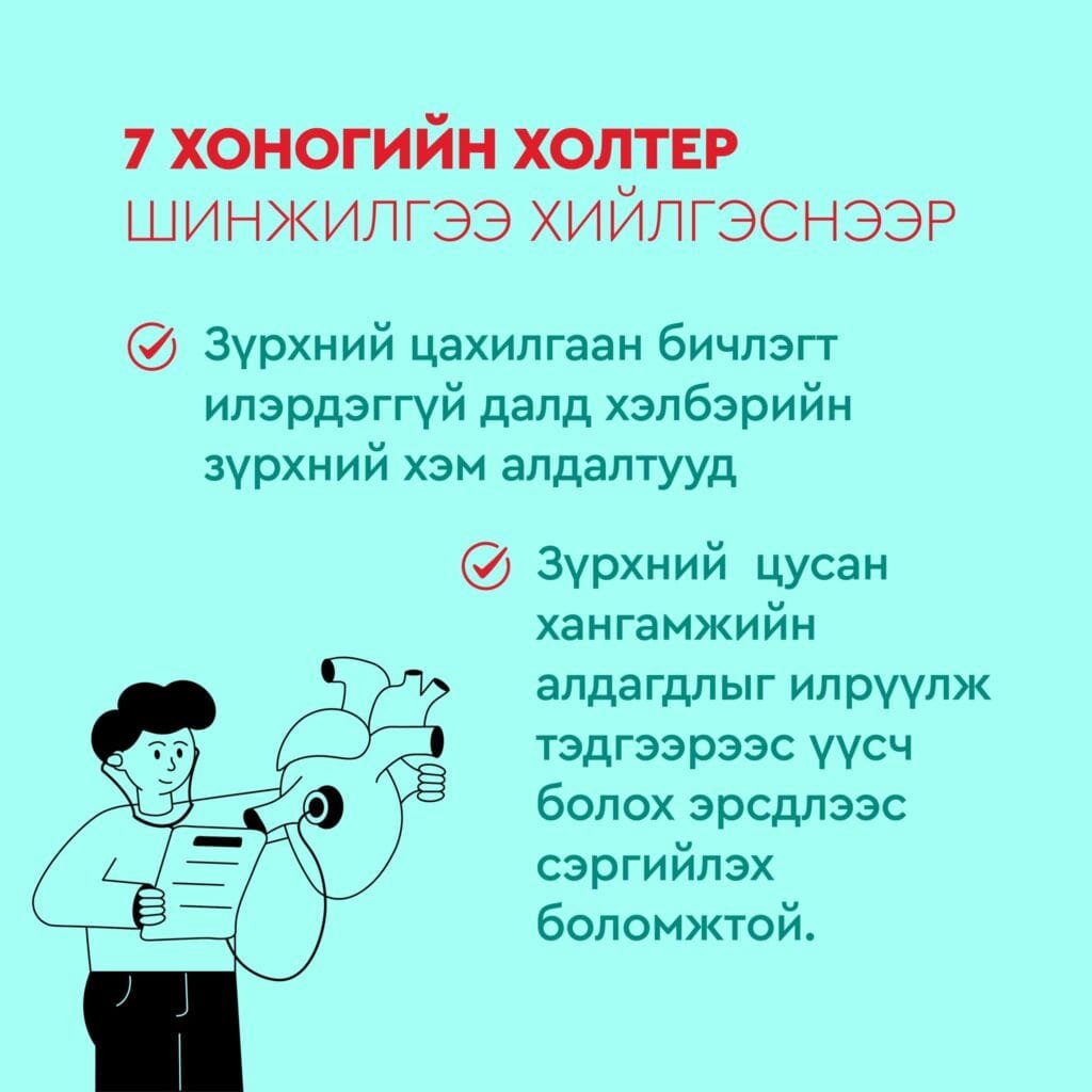 * Зүрхний нарийн мэргэжлийн эмчийн үзлэг оношилгоог гэрээр, ажлын бус цагаар хийнэ.